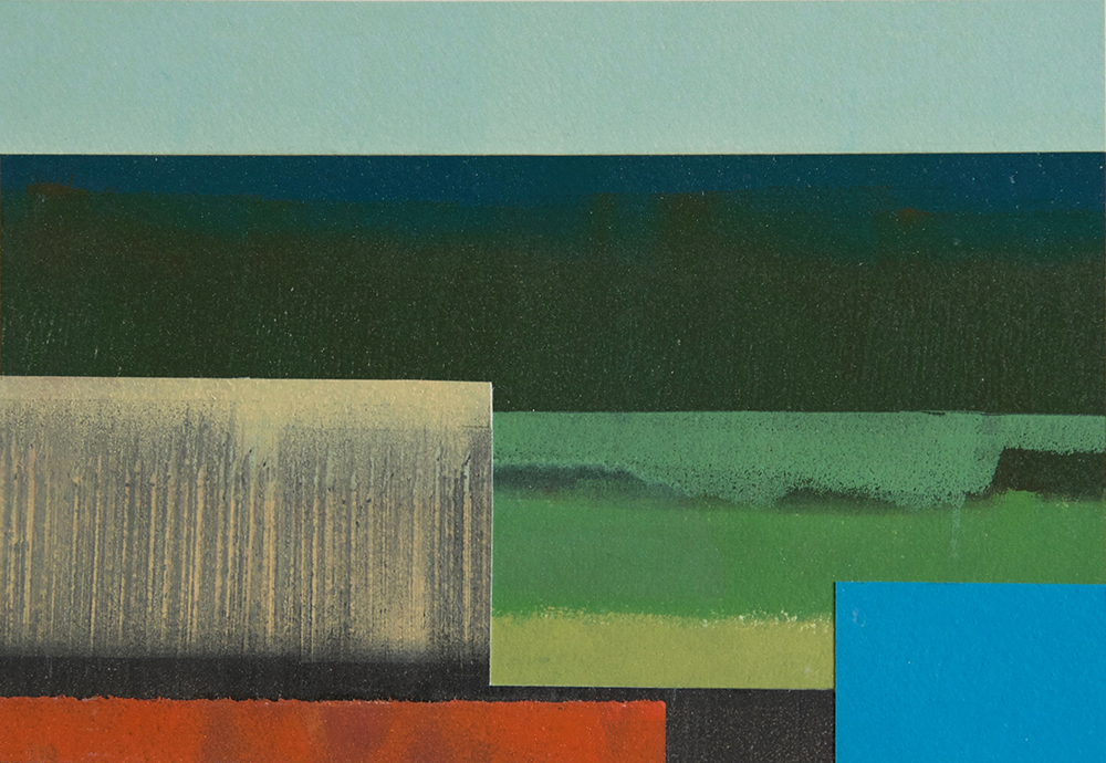 Collaged, printed papers on board. 14x20cm